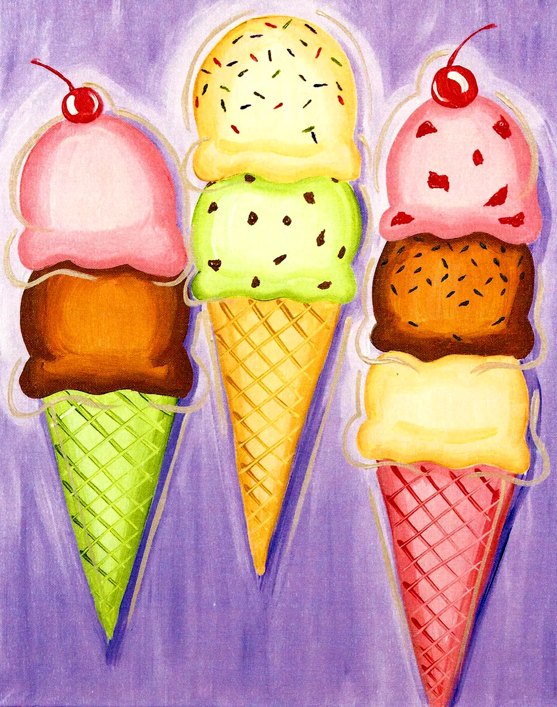 Погода за окном просто обязывает меня нарисовать что-то прохладное и вкусное, как это мороженое на картинках! Можно лишь позавидовать тем, кто может создать такие произведения искусства на холсте. Желаю всем, кто рисует, никогда не останавливаться в своем творчестве!